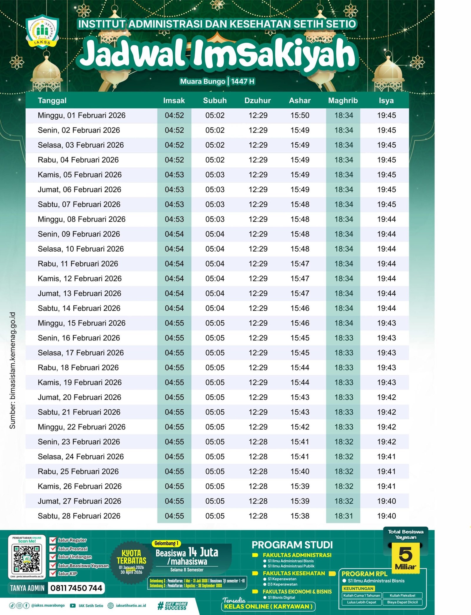 Institut Administrasi dan Kesehatan Setih Setio Muara Bungo menyediakan jadwal imsakiyah lengkap untuk membantu ibadah kamu selama bulan Ramadan 1447 H. Kamu bisa melihat jadwal waktu imsak, subuh, dzuhur, ashar, maghrib, hingga isya secara detail dalam tabel yang tersedia. Jadwal ini menjadi panduan penting agar kamu bisa mengatur waktu sahur dan berbuka dengan tepat waktu di wilayah Muara Bungo. Kami ingin memastikan seluruh mahasiswa dan masyarakat sekitar mendapatkan informasi ibadah yang akurat melalui platform resmi kampus.